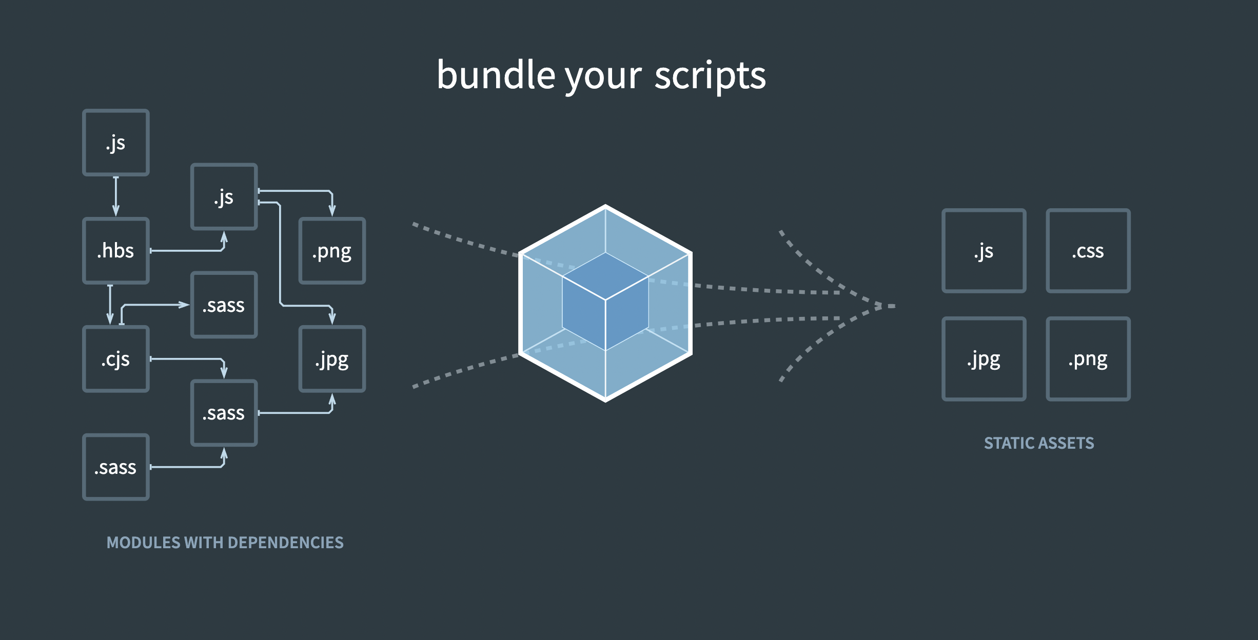 webpack is a module bundler. Its main purpose is to bundle JavaScript files for usage in a browser, yet it is also capable of transforming, bundling, or packaging just about any resource or asset.