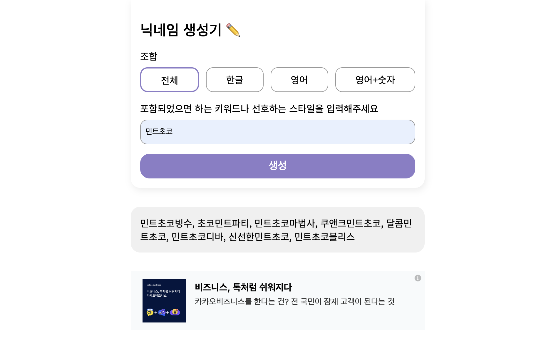 닉네임 생성 사이트. 원하는 키워드나 스타일을 입력하고 닉네임을 추천받자!