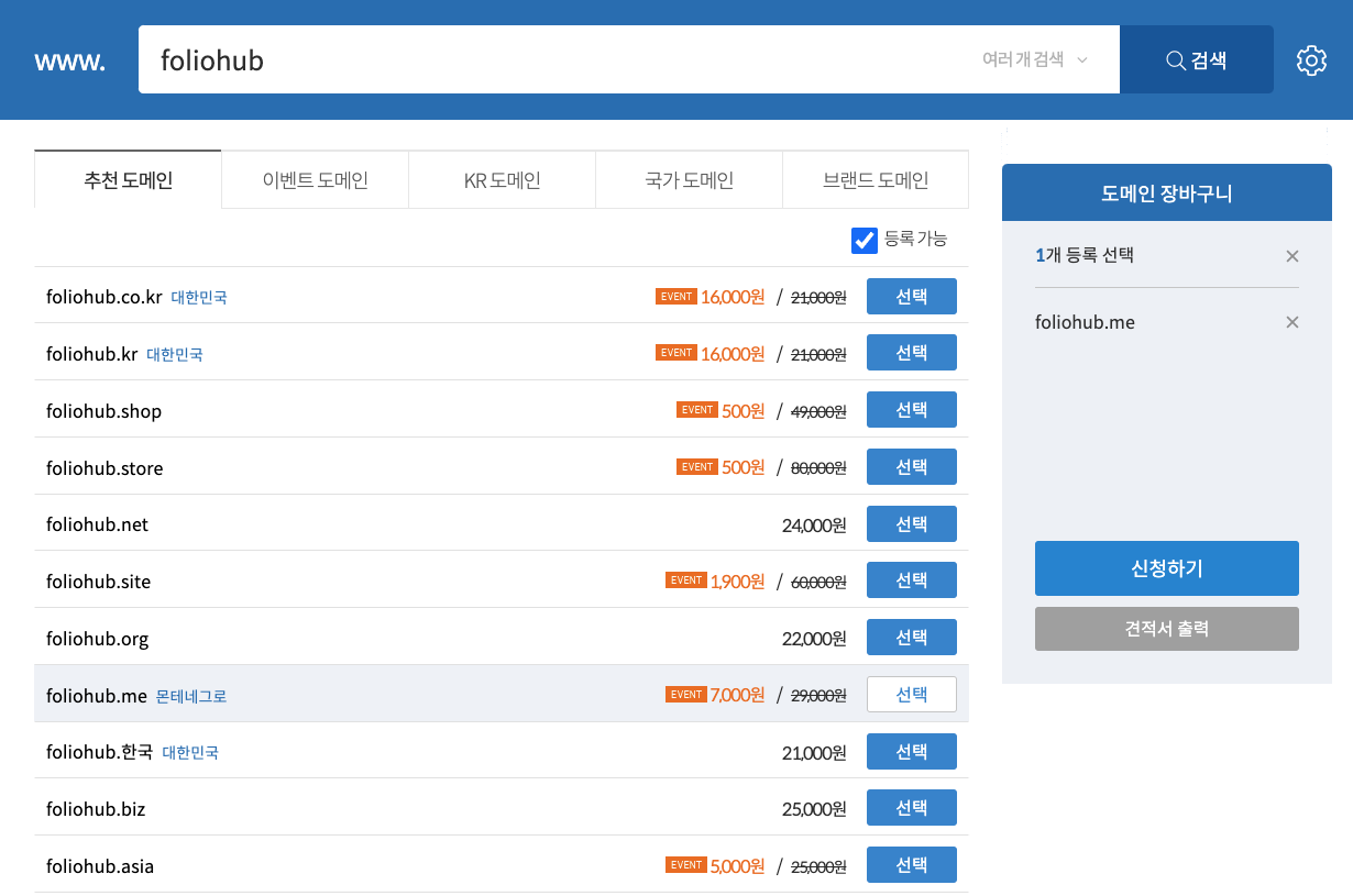 원하는 도메인을 입력하고 적절한 가격에 원하는 도메인을 선택한다.
