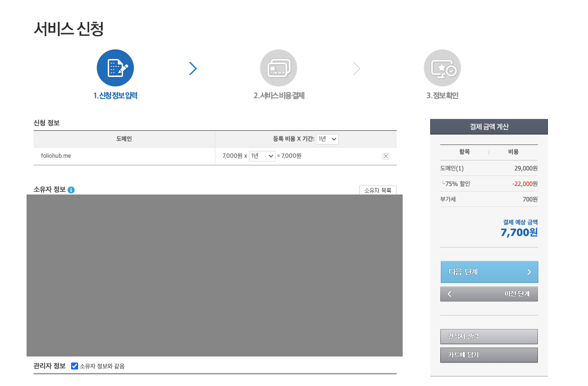 결제를 하면 이제 foliohub.me는 1년 동안 나의 도메인이다 ㅎㅎ