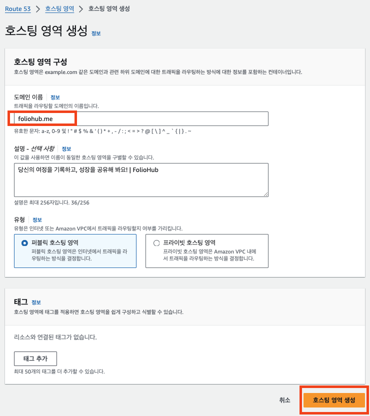 도메인 이름에는 구매한 도메인을 입력하고 (설명은 선택사항)